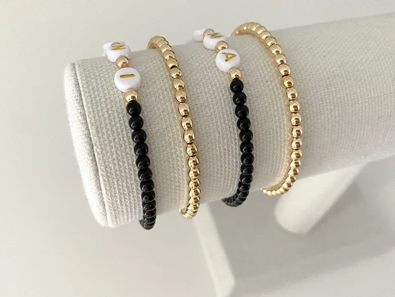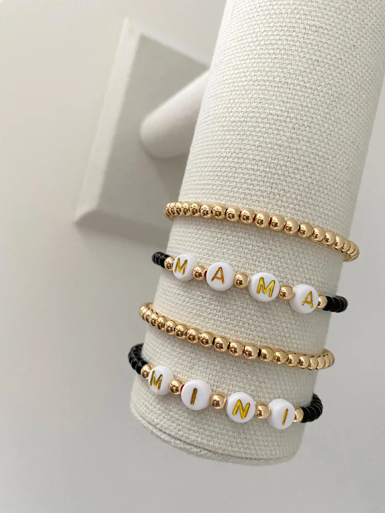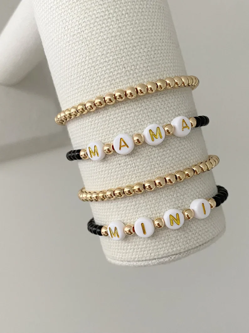one mama and one mini matching bracelet made with 4mm black matte beads with 14k gold accent beads