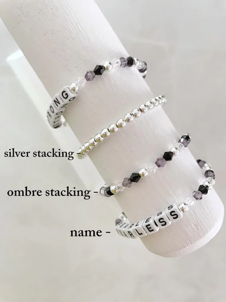 one square name bracelet made with 4mm sterling silver plated beads and 4mm crystal accent beads